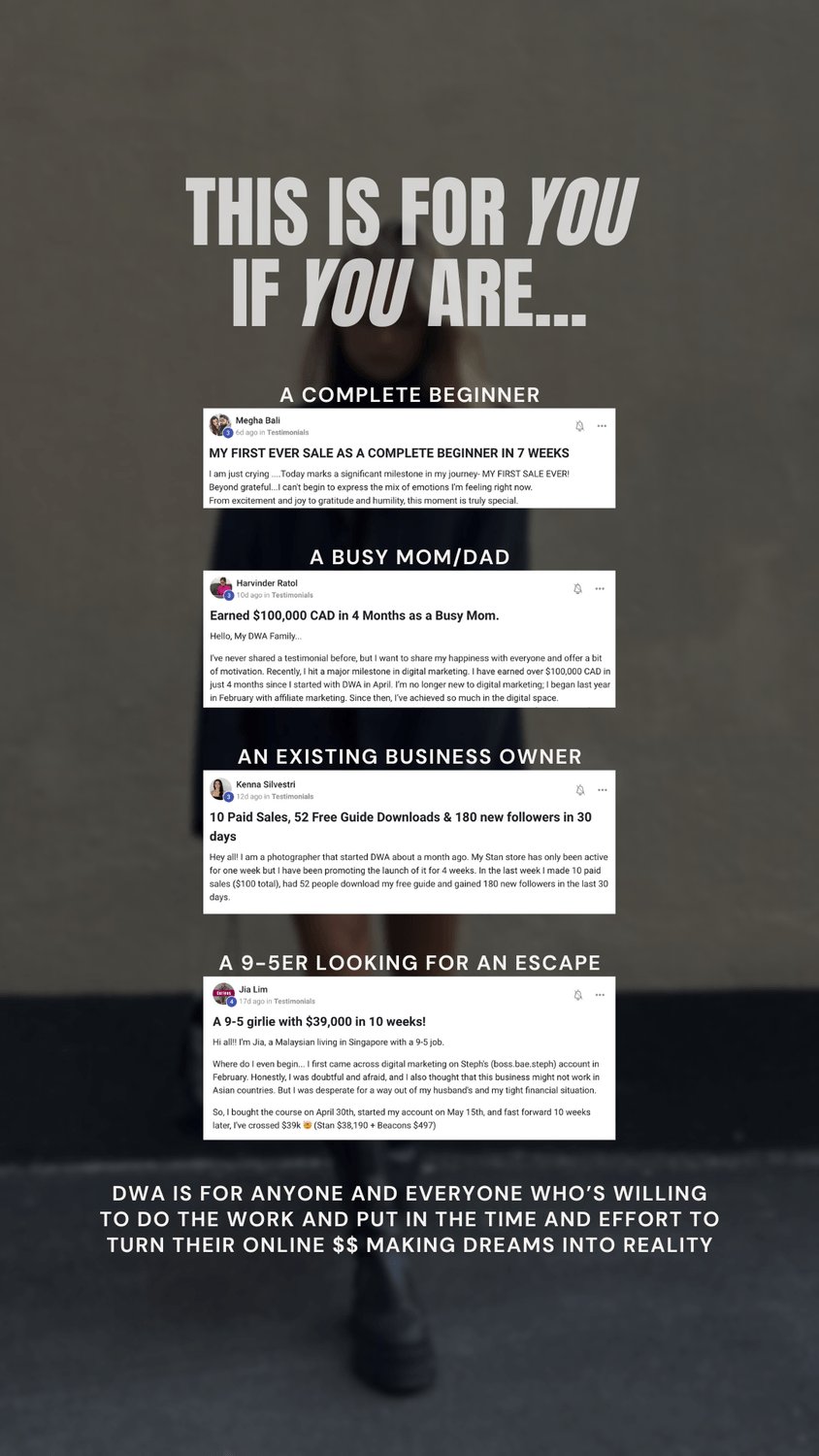 Learn how to promote The DWA course or any other product. This will teach you how to quickly grow your audience and make sales via social media marketing.